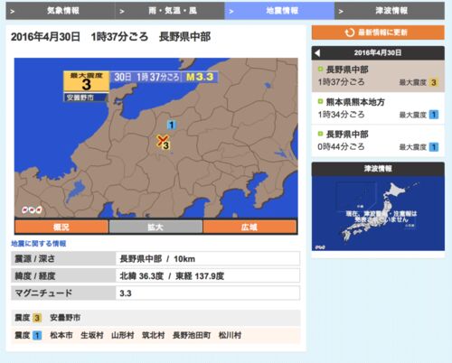 長野県中部 M3.3 震度3安曇野で地震発生 <引用> 【2016年04月30日 01時40分 気象庁発表】 気象庁によると30日 午前1時37分ごろ、長野県中部でM3.3の地震が発生し、長野県安曇野市で震度3の揺れを観測した。 この地震の震源地は長野県中部で、震源の深さは…